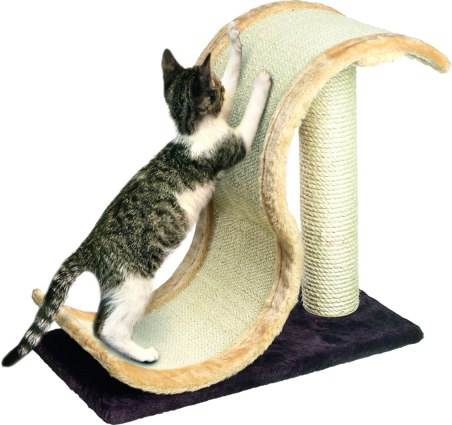 Petit meuble Ă gratter pour les chatons et les chats de petites races. La grande surface incurvĂ©e est recouverte de sisal pour que votre chat puisse s’adonner Ă son passe temps favori : prendre soin de ses griffes.