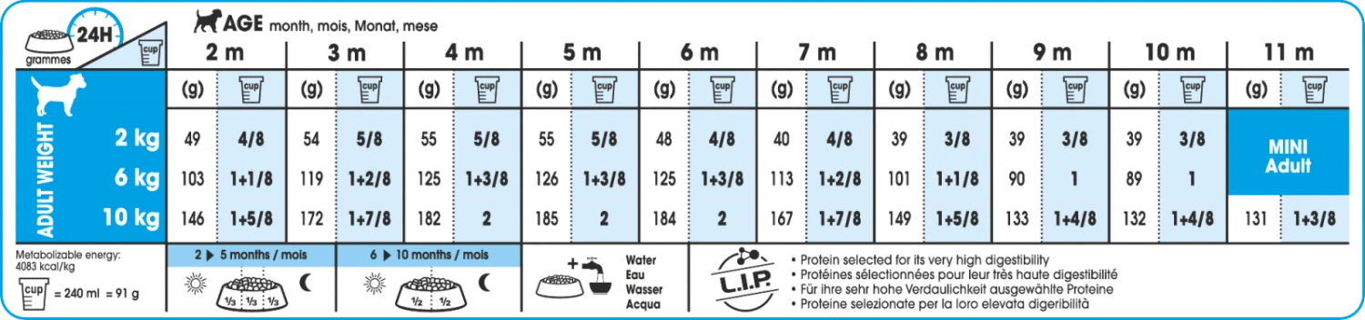 Répond aux besoins énergétiques élevés du chiot de petite taille en phase de croissance et satisfait les appétits difficiles.