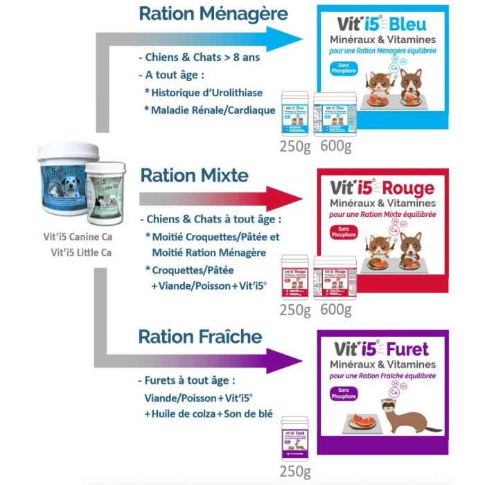 Une ration mixte manque de certains minéraux et vitamines, même si le chien ou le chat consomme un aliment industriel, un peu de fromage, de yaourt ou de lait. Il est indispensable à leur santé de leur apporter Vit’i5 Rouge tous les jours.