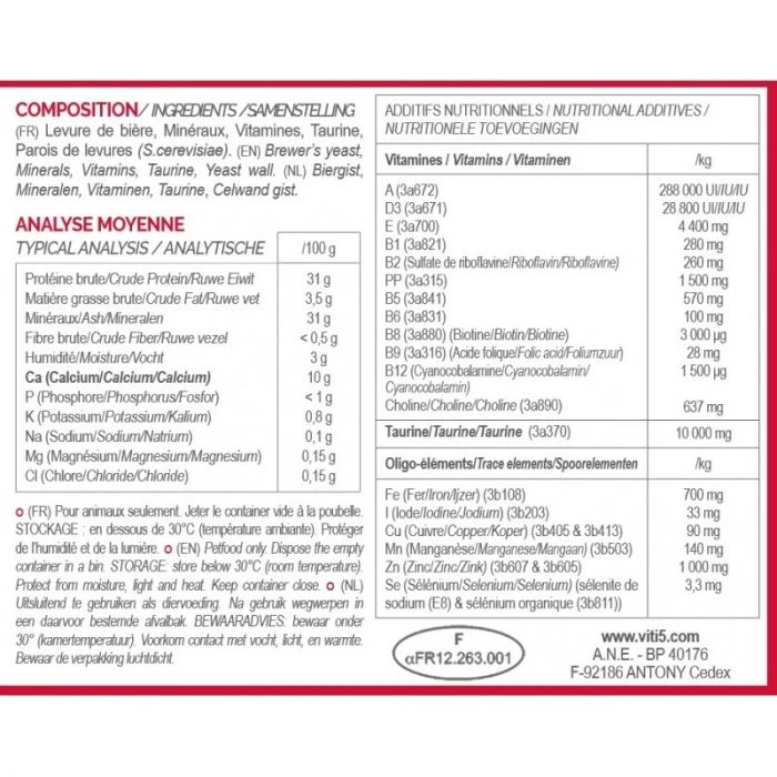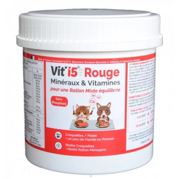 Vit’i5 ROUGE est formulé spécifiquement pour équilibrer en minéraux, vitamines et oligo-éléments l’alimentation mixte des chiens et chats.